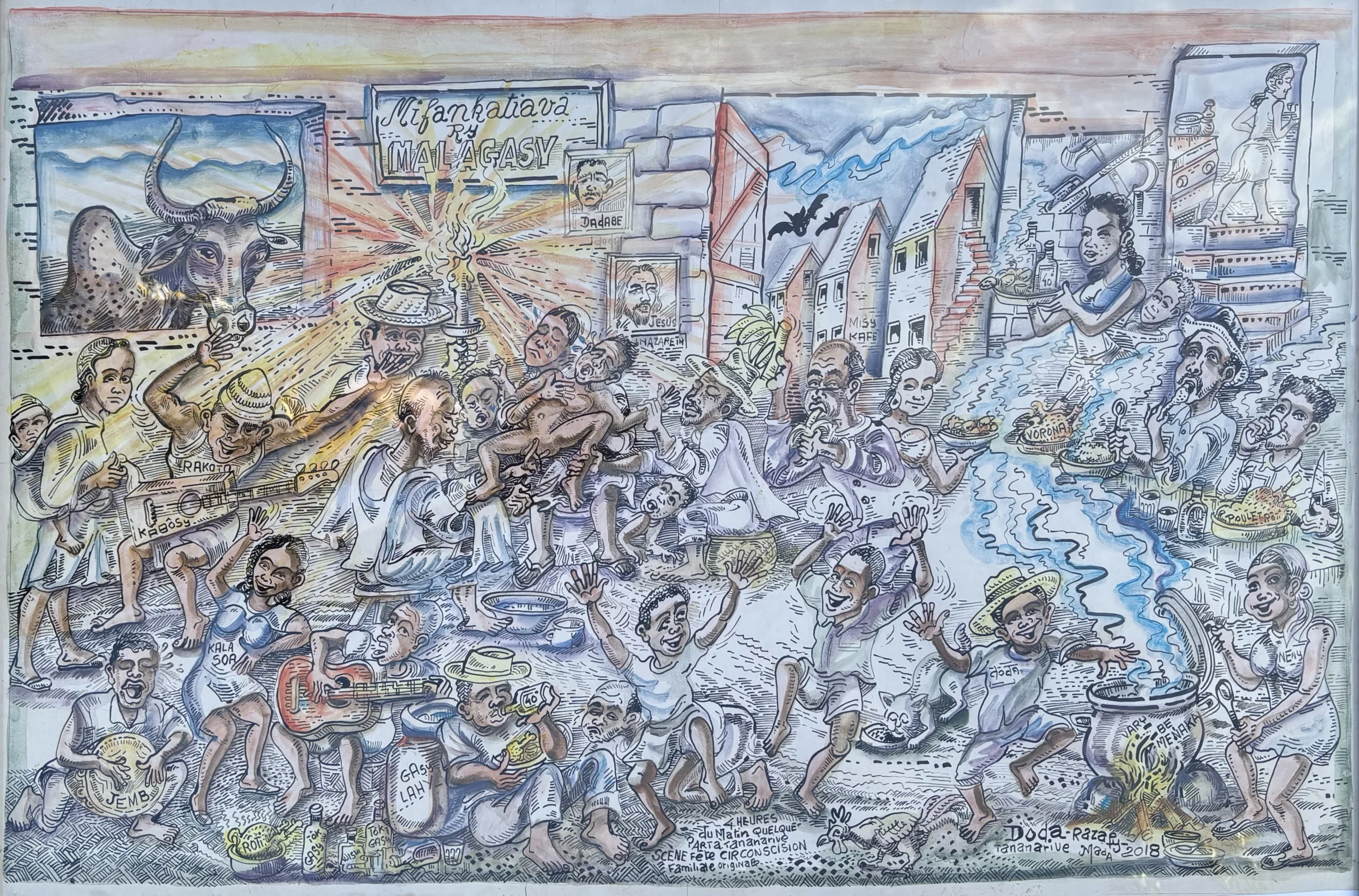Un village en liesse, rythmé par les tambours, guitares et rires d’enfants. Doda Razafy illustre ici une scène de circoncision traditionnelle, moment d’union sacrée entre familles et voisins. Autour du feu, les mets mijotent, les musiciens enflamment l’ambiance, les danseurs élèvent leurs bras vers le ciel. L’œuvre déborde de vitalité et de chaleur, reflet d’une culture où fête, solidarité et spiritualité se confondent dans une même ferveur.