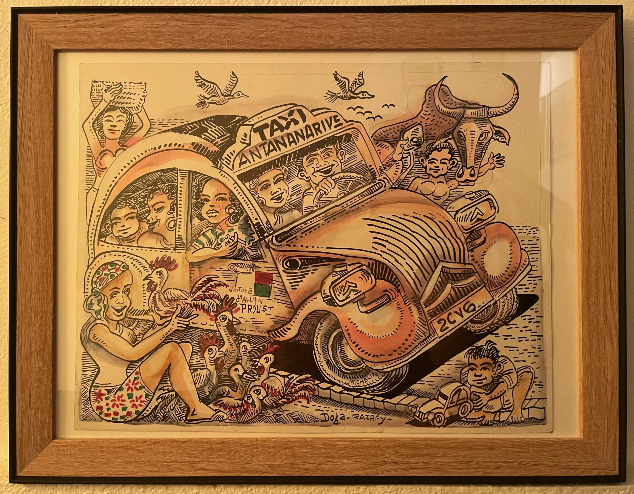 Dans cette scène pleine de vie, Doda Razafy immortalise l’iconique 2CV, transformée en taxi d’Antananarivo. Serrés à l’intérieur, les passagers sourient malgré l’exiguïté, reflet de la convivialité malgache où le partage prime sur le confort. Autour du véhicule, la rue s’anime : une femme joue avec ses volailles, un enfant observe, et même les zébus semblent participer à l’effervescence. Entre humour et tendresse, l’artiste fait de ce taxi bondé une métaphore de la solidarité et de l’ingéniosité du quotidien malgache.