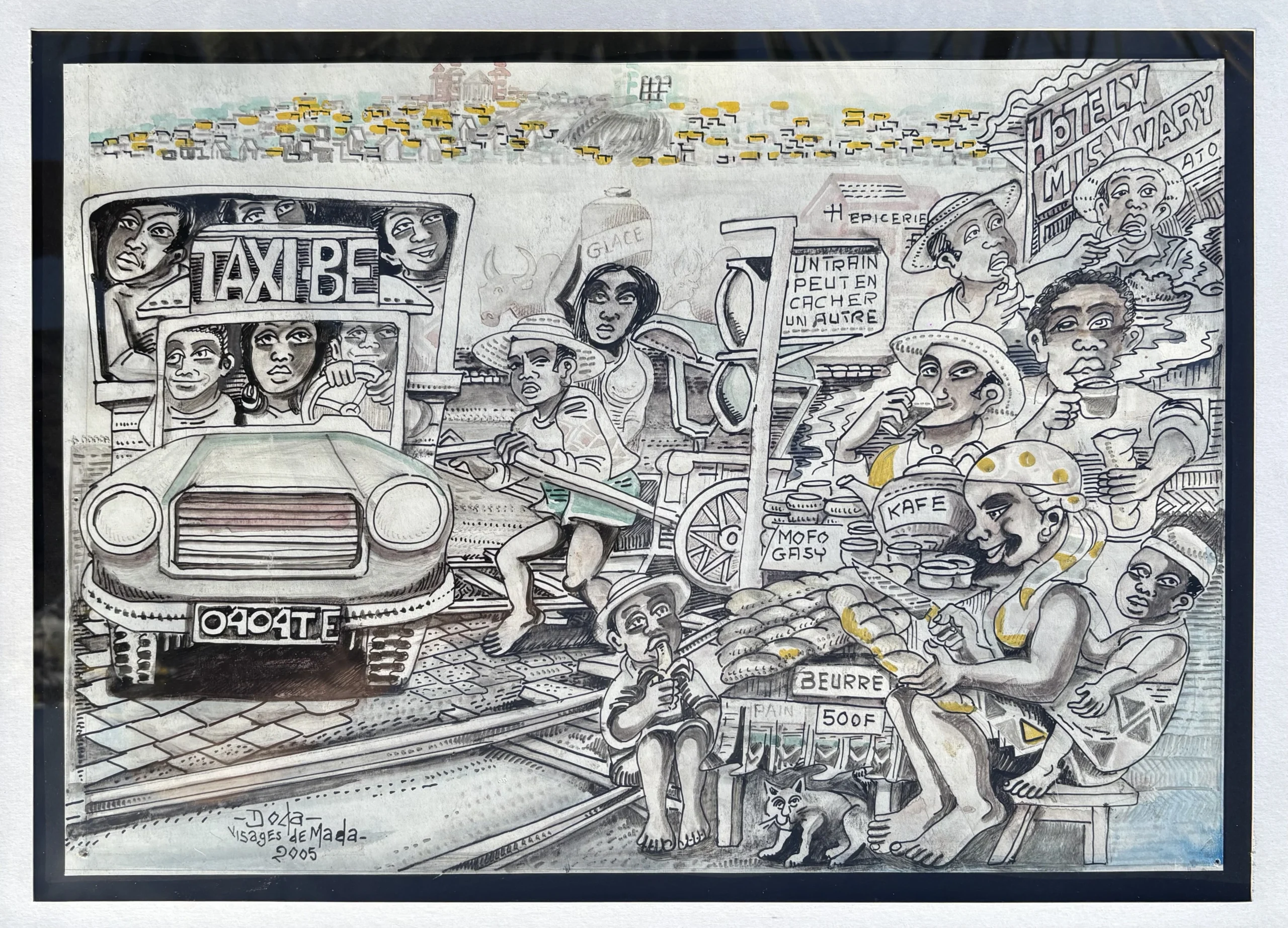 Dans cette scène foisonnante, Doda Razafy nous plonge au cœur de la ville malgache. Un taxi-brousse bondé fend la rue, entouré de marchands, tireurs de pousse et badauds. Les enseignes colorées — Mofogasy, Kafe, Beurre — rappellent les petits plaisirs du quotidien. Entre chaos urbain et chaleur humaine, chaque visage, chaque geste raconte l’histoire d’une cité vivante, où la débrouille et la convivialité règnent en maîtres.
