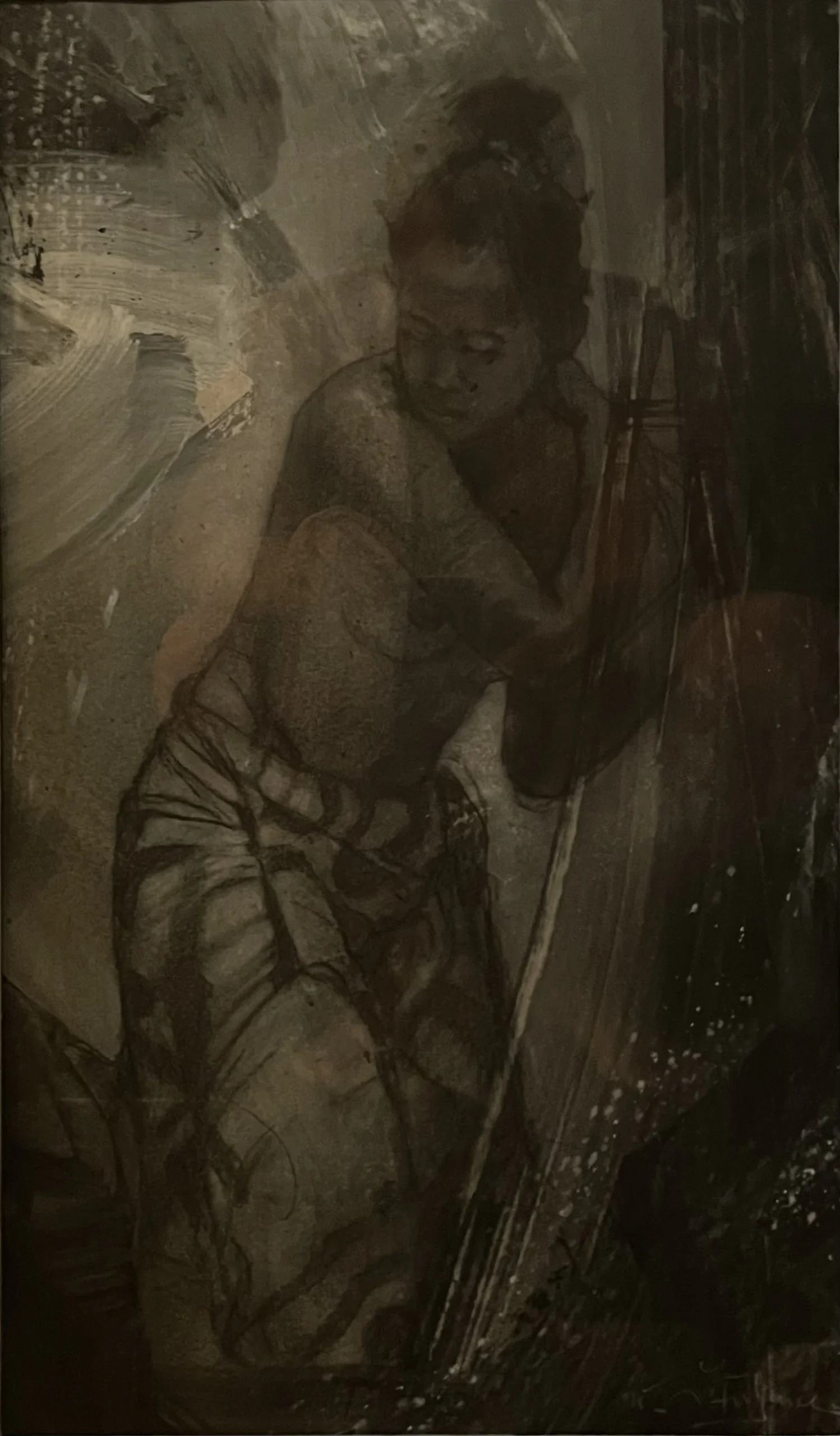Dans une lumière tamisée, presque brumeuse, se dessine la silhouette d’une femme enroulée dans un paréo. Son geste, suspendu, semble à la fois pudique et tendre, comme un instant saisi entre la rêverie et le souvenir. Le corps émerge d’un clair-obscur soyeux, où la matière picturale — faite de lavis et de transparences — évoque le mouvement de l’eau et la douceur d’une peau caressée par la lumière. Fulgence parvient ici à conjuguer sensualité et mystère : la figure féminine n’est pas montrée, mais suggérée, incarnant la force tranquille de l’intime. La Baigneuse amoureuse n’est pas un simple portrait, mais un murmure visuel — celui d’un sentiment discret, presque sacré, qui flotte entre ombre et lumière.