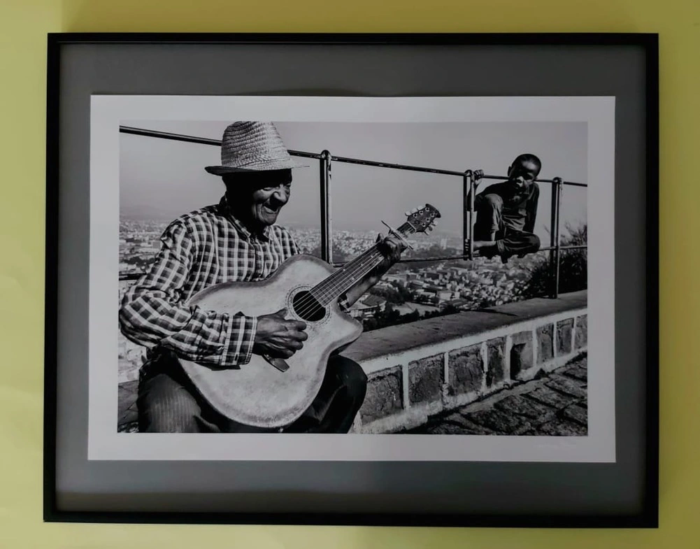Un musicien souriant fait résonner sa guitare au-dessus de la ville, tandis qu’un enfant observe, suspendu à une rambarde. Pierrot Men capte un instant simple et vibrant, où la musique relie les âmes et surplombe le tumulte de la cité.